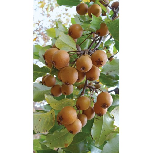 The variety ‘Keifer’ and ‘Le Conte’ came from this cross and are cosidered 'pie pears.'This small pyramidal tree produces ½-1 inch yellow fruit with has glossy green leaves. Enjoy its beautifully rich autumn color of reds and purples. Ecos Lecont Pear was found as a seedling tree in our plantings that came from a group of tall wild pears in a hedge row in southwestern Michigan. We started with two trees from this cross and one of them produces very uniform seedlings that could be used either for fruit or even grafting as a rootstock for other pears..The tart fruit hangs in massive quantities and drops throughout December. It is an excellent fruit producer for birds and deer. Trees maintain a strong central leader. There was one season where a portion of the tree suffered from fireblight. But over the course there have been no other insect or disease problems. The flavor of the fruit once processed is very good and it is used for drinks and syrups as well as jelly with a punch.