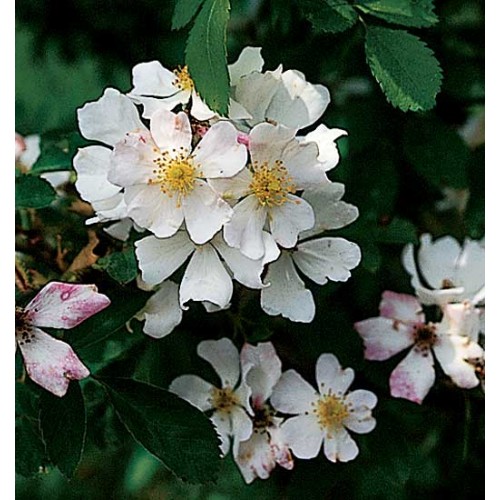 An excellent species rose due to its prolific flowering and fruiting. Does not sucker and over 90% of the seed are empty, so the chance of introducing it where you don't want it is small. Similar in flower and fruit to multiflora rose, only more compact with larger pink-tinged flowers. Flowers have a nice flavor but the fruits are too small to eat fresh but man vs. wild could do it. The fruits remain on all winter in good condition. The canes on this species like multiflora rose help give cover to birds and mammals. Studies have confirmed the highest wildlife ‘hits’ with a row of these. Completely disease-free. Vigorous growing with large spreading canes up to 8 ft. across. Can be pruned flat after they become less productive. Seed collected in the mountains in Korea from an unknown species rose. Height to 3-6ft.