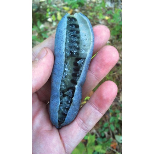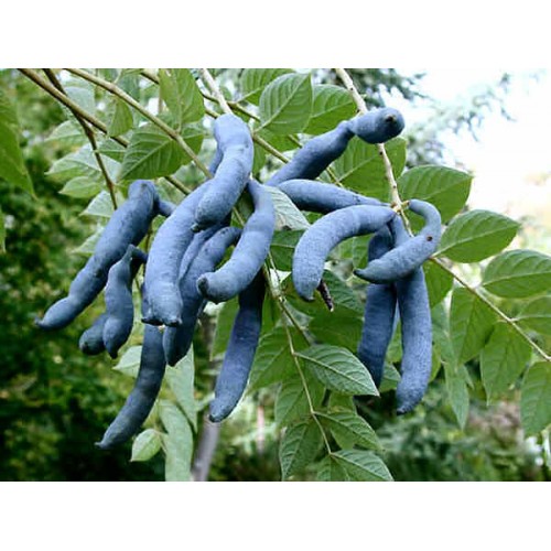 Blue Bean or Blue sausage fruit produces a sweet tasting pulp with a very mild, delicate taste similar to a mulberry.  It is consumed in China where it is called Wu-yueh-kua-teng. You peel it like a bean eating the flesh around the seeds. In the Akebia family, Blue Bean is a small shrub or perennial that grows best in part shade in good moisture retentive soil. Under the right conditions it will grow into a shrub up to 8 ft. tall and wide looking a lot like an elderberry plant. It can be grown as an edge woodland plant in dappled shade or full sun. Seedlings will grow fast after transplanting and create a long lived root system.Very easy to grow in a variety of climates from zone 5 to 10. It is self fertile.