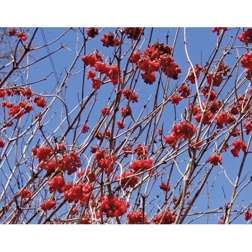 Seedlings are compact in growth and fruit heavy at a young age with exceptionally bright dark red berries. Height is a little shorter than the species from 4 to 8 ft. This selection is a good one for fruit production. The plants have almost a spur type fruiting habit much like apples with fruiting occurring all along the branches.  The fruit size is smaller than others but it still has the same quality. It is necessary to let these freeze quite a few times before they are palatable to any extent. Once bletted fully the fruit does taste like a cranberry but it has to processed with sugar  or a sweet fruit juice.