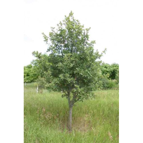 This seedling selection of oaks comes from a mix of hybrids in our planting that are considered natural dwarfs and stay green late into the fall. The tree structure can be an open upright pyramid while some are more oval in shape with a rounded top. All have thick, semi-evergreen leathery leaves. Excellent tree for very poor soils. Small acorns are produced almost yearly. Many of the seedlings are also natural crosses with larger leaved nearby white oaks in our plantings.