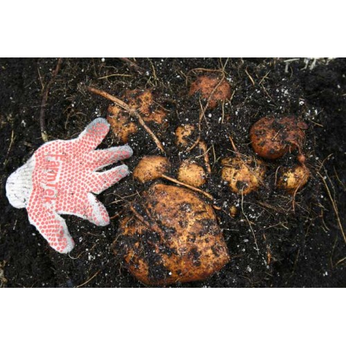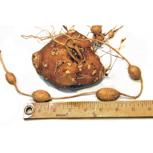 Originally bred in Louisiana this selection is tops in tuber size. Nuts average 3 to 5 inches in diameter and have a very smooth light skin. Vines can grow up to 50 ft. or more in a single season so trellising would be of benefit. Completely hardy and productive in southern Michigan. Excellent potato flavor. Great fried in ghee. Available during the dormant season from mid October through early May.This selection is one of the earlier varieties selected from the LSU breeding program. We are unsure if its exact number but might be similar or identical to 1972 or 2083. Some of the less known selections were given to us many years ago and we began growing them under the 'Nutty' name as they had no formal name at that time.  Each of these selections are worth growing in northern reaches of zone 5 but tuber size tends to be smaller reaching only3-4 inches in diameter. But if in doubt for your region try the 'Kennebec' variety. Even though a nitrogen fixer adding additional nitrogen appears to really crank out the tubers and increases vine growth tremendously.