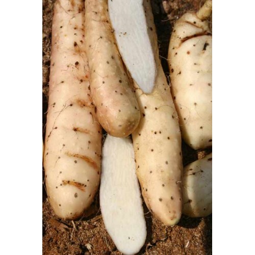 - Japanese Large white root with uniform growth and a large rounded tuber. Easily digestible and one of the few where the roots do not dive as deep into the soil making harvesting easier. The aerial tubers are also quite large some reaching up to quarter size.