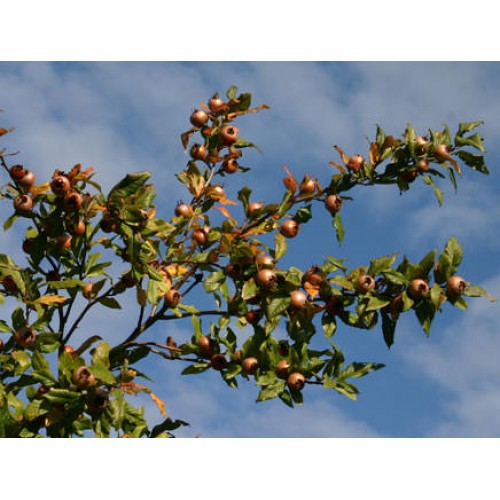 This small fruited strain of medlar is ideal for late fall early winter consumption. The fruit 'blets' or freezes and thaws leaving a creamy pear like texture with a flavor much like a pear and apple combined. The Ecos strain was collected from a nursery that specialized in fruits for birds and then established at our farm on a sandy bluff. This is the most productive of the medlars we have with double the yields of the large grafted types but the fruit is half the size of the grafted types.