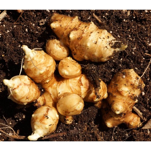 This sunchoke has a large pinecone shape and a strong, nutty flavor. It's not a sweet one, but has a very earthy flavor and is very large in size. Truly looks like something from outer space as the giant tubers take on a life of their own in terms of growth habit. Give this plant lots of room and the tubers can grow to large size 2-3 times the size of other sunchoke varieties easily. This species has a strong stem structure as well. Each tuber would be a meal with this one. The flavor is best in spring. Sometimes we have to split the tubers before packaging. This does not interfere with the yields in the first year at all.  There are additional smaller but more round tubers that form on the underground roots as well which are not very knobby making them easy to clean.